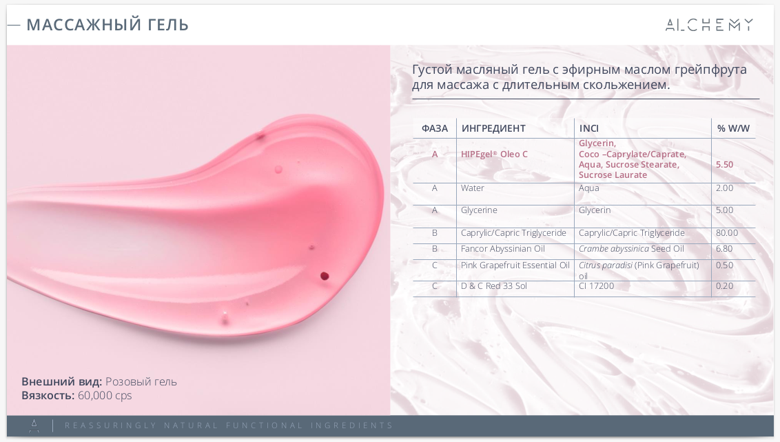 Гели на основе HIPEgel Oleo C по сравнению с рецептурами на Sucragel дают лучшее скольжение и приятную сенсорику. HIPEgel Oleo C позволяет создавать масляные гели с концентрацией масляной фазы 80-90%,обладающие уникальными легкими ощущениями на коже и "quick-break" эффектом (при нанесении на кожу гель превращается в масло, при добавлении воды — в эмульсию). Совместим со всеми типами масел, кроме высокополярных.