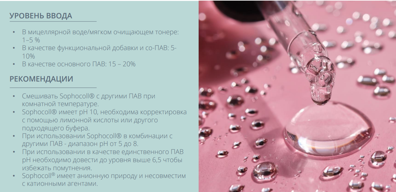 Sophocoll® совместим с холодным способом введения, легко диспергируется, стабилен в широком диапазоне рецептур, подходит для мицеллярной воды, шампуней, гелей для душа, пенок для умывания и средств для волос.